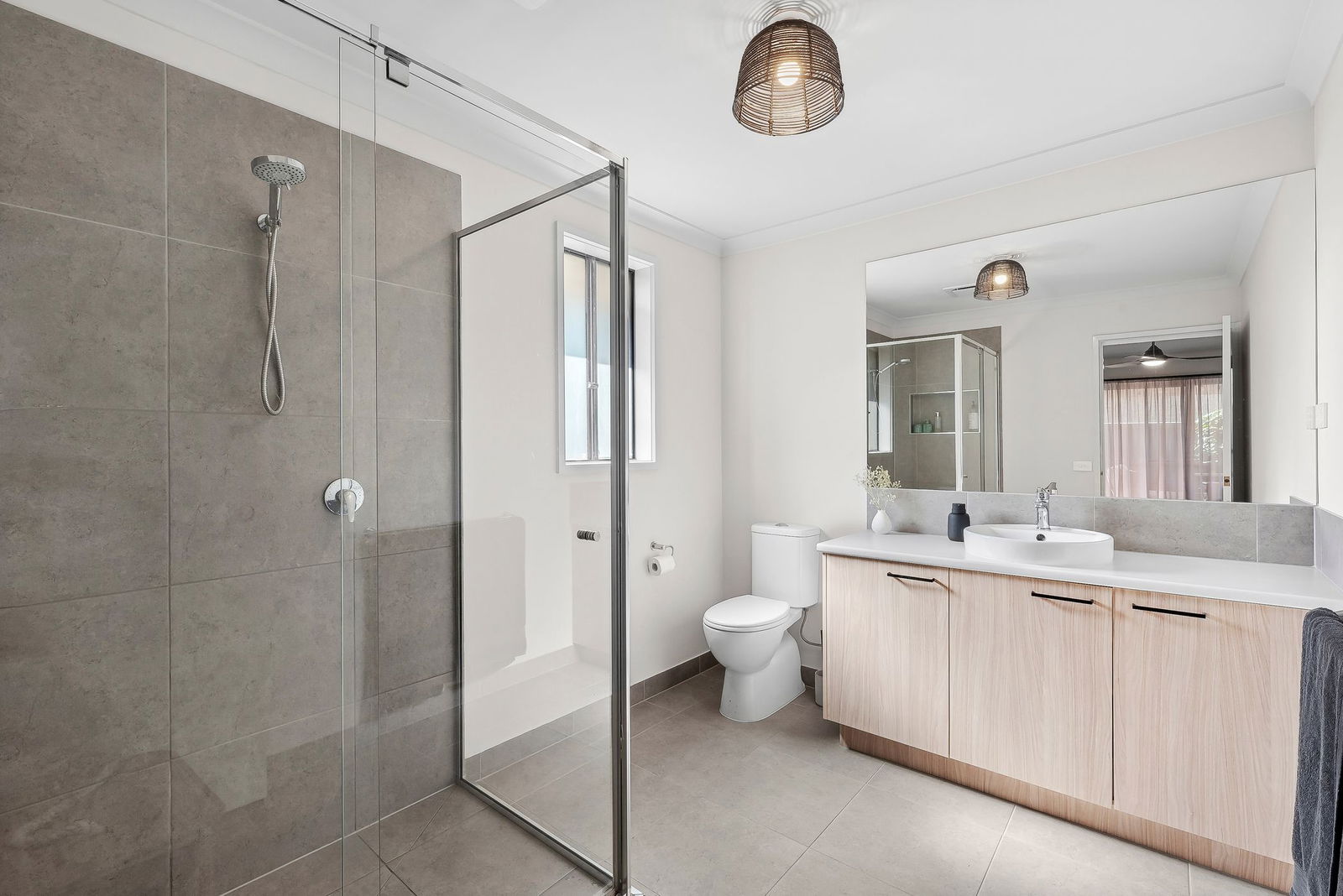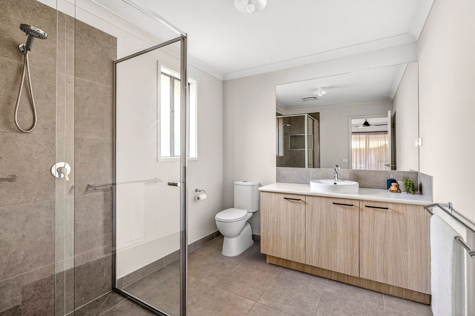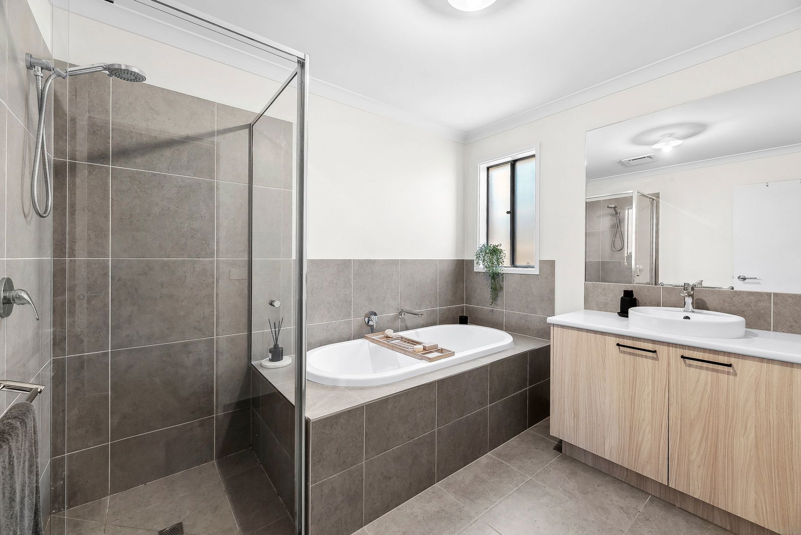 Main Bathroom – Perfectly presented bathroom with bath, timber-look vanity & tiled shower