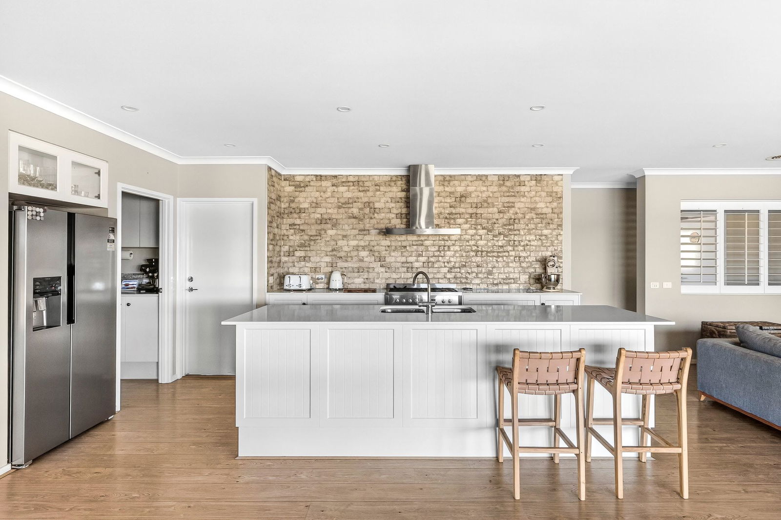 Kitchen: 900mm dual-fuel cooker, walk-in pantry, canopy rangehood, dishwasher, expansive island bench with dual sink, chrome tapware, shaker-style cabinetry, feature splashback wall, fridge cavity with overhead cupboards, and stone benchtops.