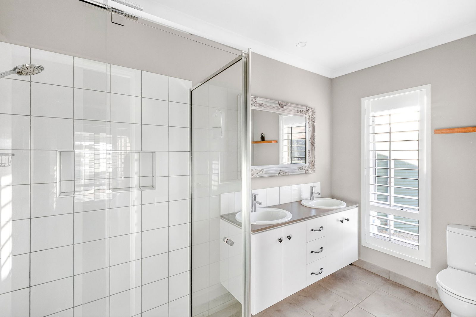 Main Bathroom: Tub with tiled surround, single vanity with underbench storage, shower with chrome tapware and wall niche, circular wall mirror, window with plantation shutter, and separate toilet.