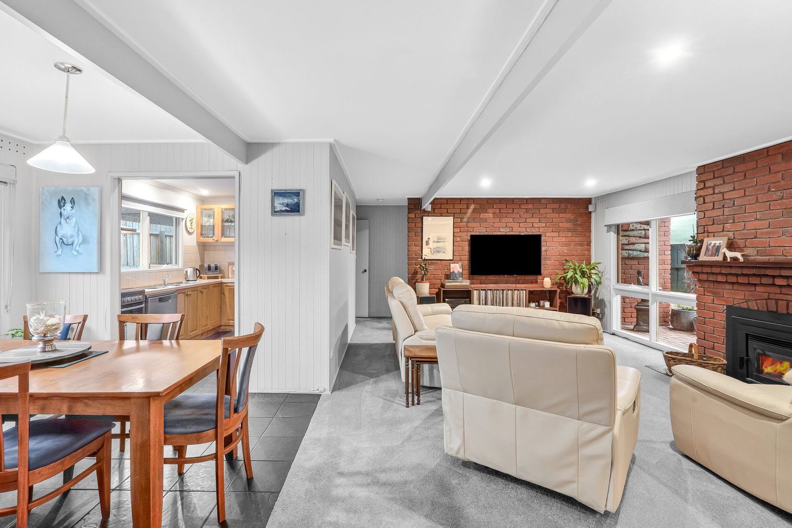Open Plan Living/Dining: A combination of tiled and carpet flooring define each area, exposed interior brick walls, split-system air conditioning unit, window bank with glass exterior door, gas wall heater, wood heater, roller blinds, glass front door entry, downlights and feature dining pendant.