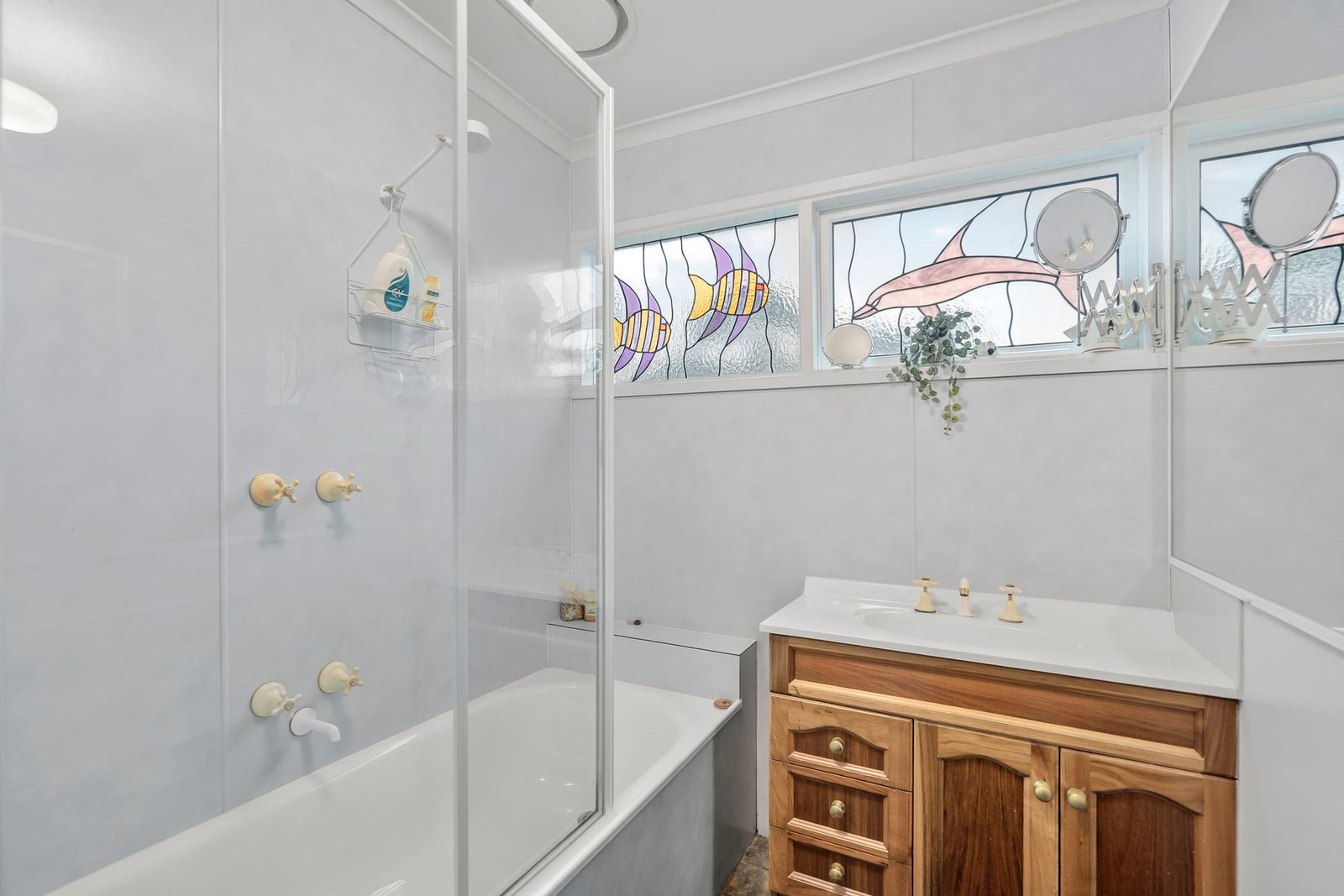 Main Bathroom: Combined shower and tub, leadlight windows, timber vanity with underbench storage, and wall mirror.